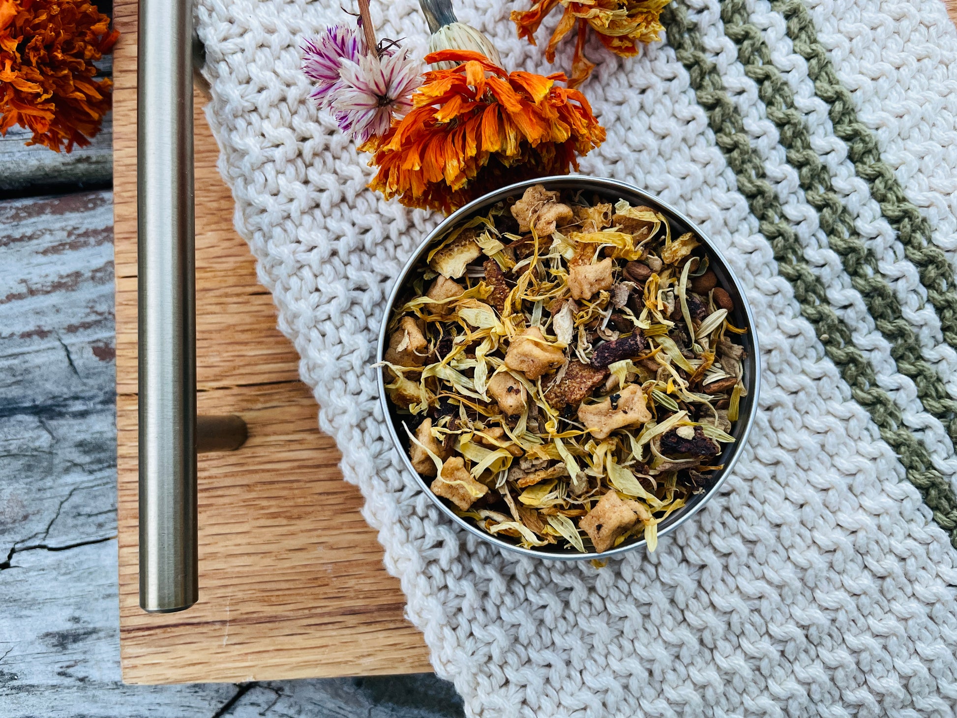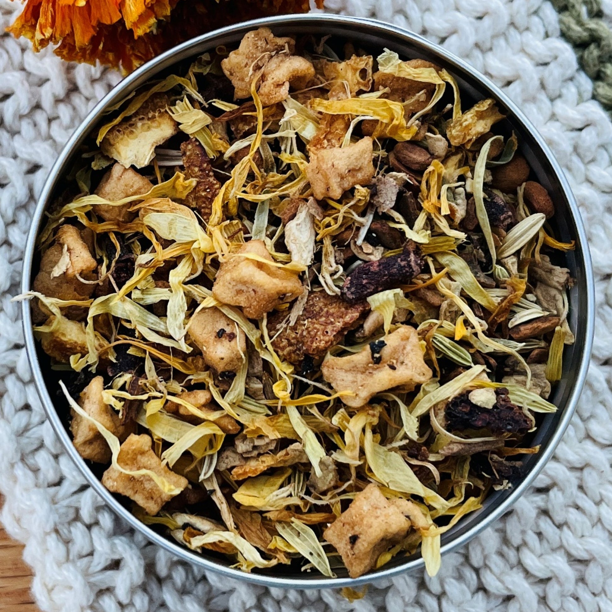 Ingredients: Dried apple, cinnamon, ginger, orange peel, fennel seed, chicory, clove, calendula petals