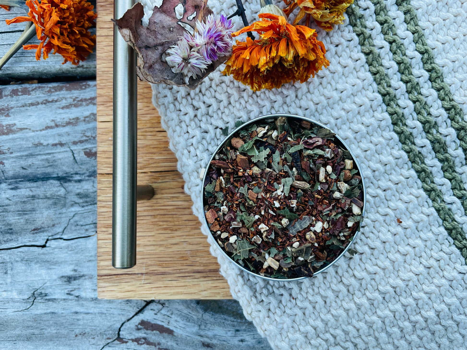 Smooth rooibos and roasted dandelion root create a rich, toasty base in this comforting blend. Cacao nibs add a hint of chocolate, while cinnamon brings gentle spice. Walnut leaf lends earthy depth, and vanilla bean finishes with a warm, creamy sweetness. Vanilla Walnut is a cozy, indulgent cup. Naturally caffeine-free and perfect for curling up with morning or night.